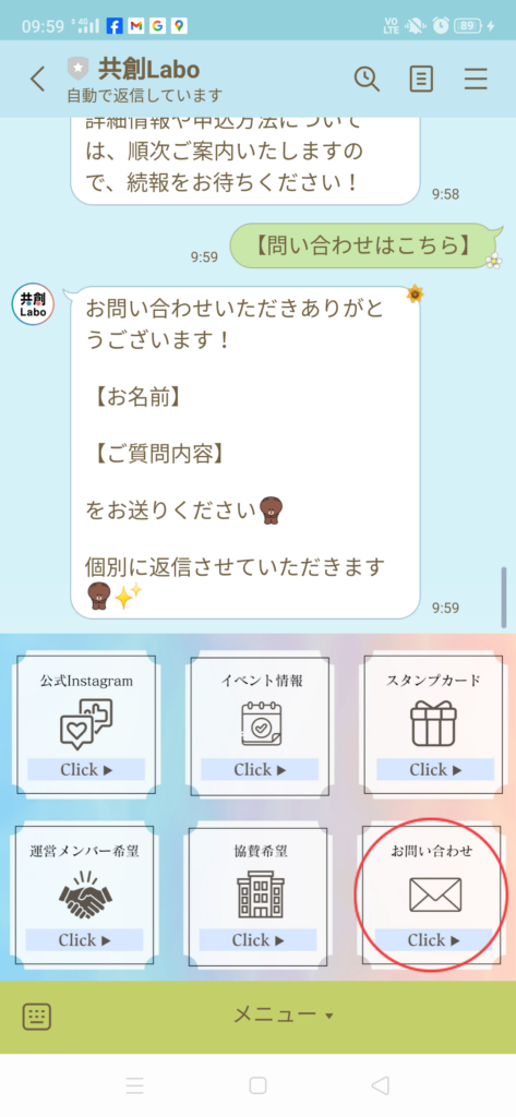 - lineをお友達登録していただくと、右下にお問い合わせボタンがあります。